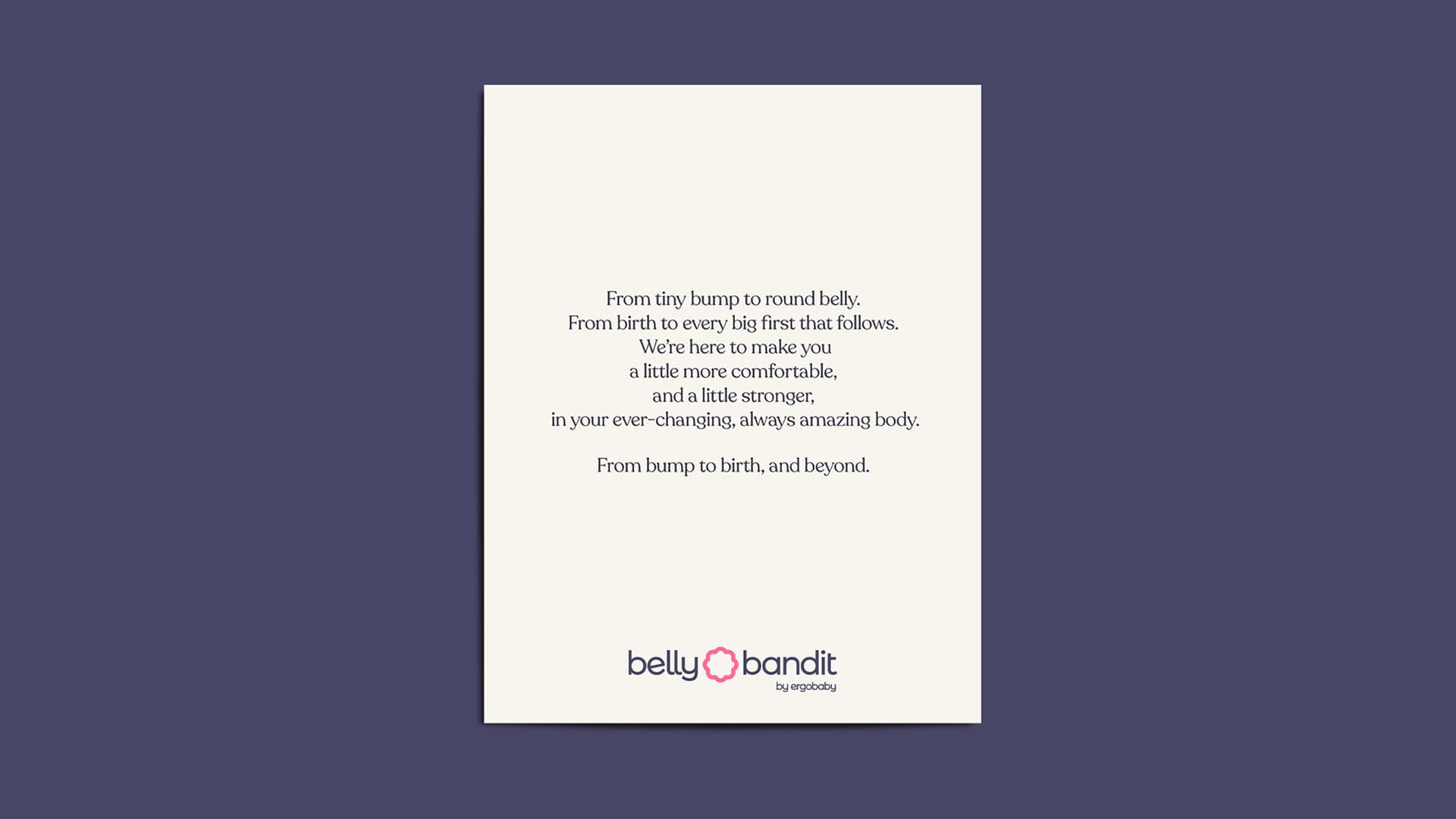 We created a strategic positioning of “Confident Encouragement,” the lens through which all brand elements and creative decisions were crafted. The role of the brand was attuned to an “inspiring mentor, trainer, or guide.” Belly Bandit provides not only the physical support, but also the mental and emotional support, resources, and knowledge to best equip her throughout the journey. Thus, the lower-case sans-serif logo and color palette of navy blues, peaches, and restrained pops of bright pink are inviting yet professional; approachable yet credible; conversational, yet dependable. The photography and film provide “Confident Encouragement” by showcasing diverse and beautiful bodies against a backdrop of warm and cinematic lighting. And the copywriting flexes to express levity, tenderness, and strength, because “Confident Encouragement” calls for different emotions to be pushed and pulled at just the right times.